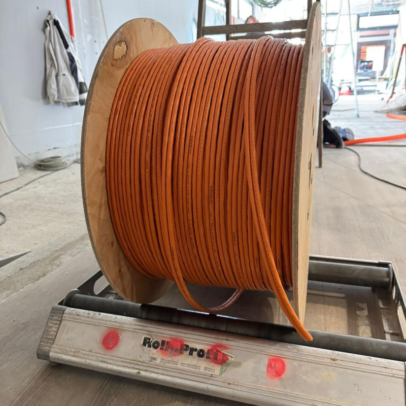 Die großen Kabeltrommeln und -bündel, die derzeit durch die Räume gezogen werden, versorgen in Zukunft eine moderne Infrastruktur – von Beleuchtung über digitale Systeme bis hin zu klimatisierten Bereichen. Auch das orangefarbene Starkstromkabel auf der Trommel zeugt von der leistungsstarken Ausstattung, die wir hier verbauen lassen.