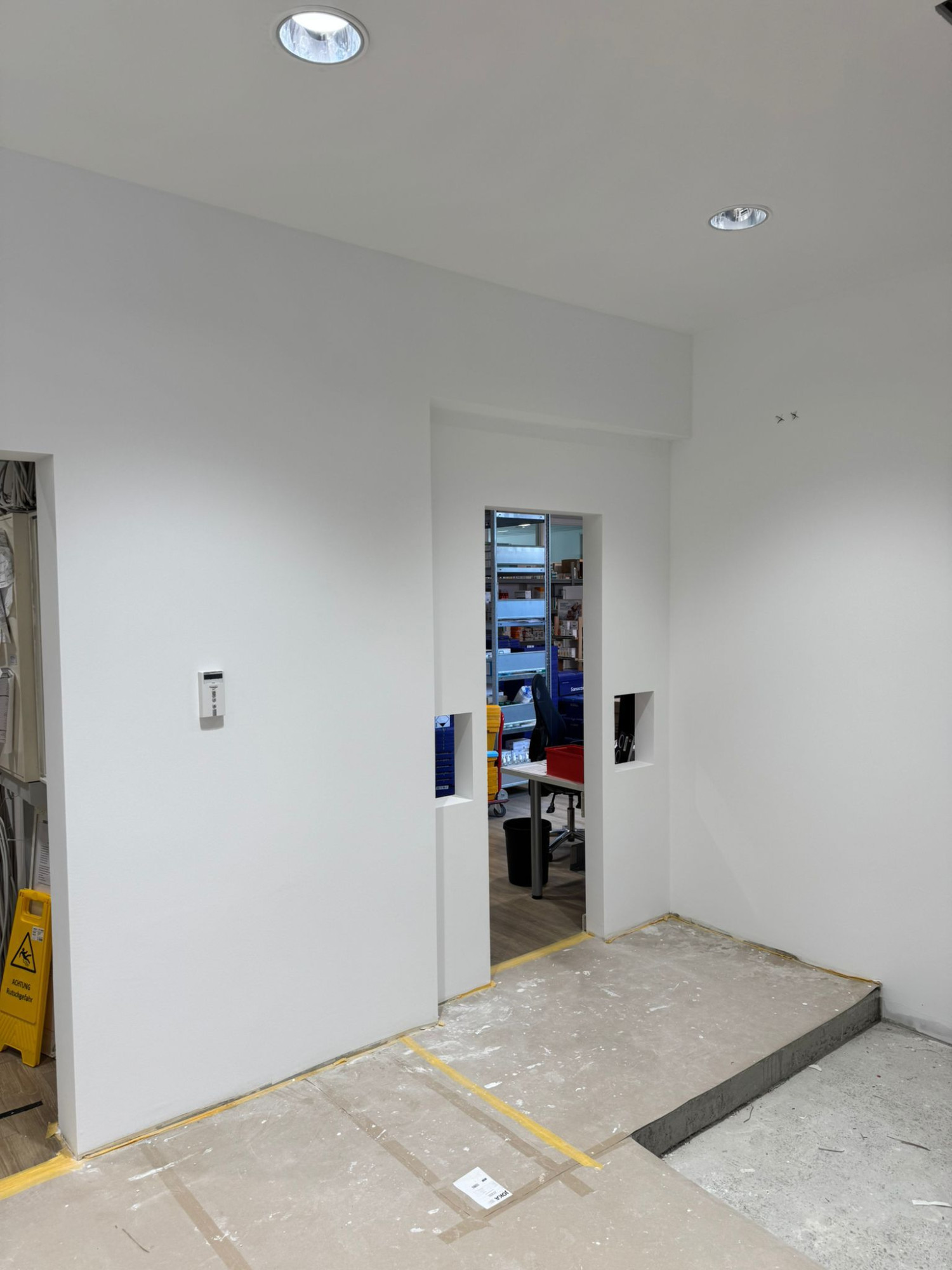 Fast gleichzeitig zog das Licht ein: Neue Deckenstrahler, weiße Wände und viel Helligkeit lassen unsere Räumlichkeiten völlig neu wirken. Die technische Infrastruktur dafür hängt bereits über unseren Köpfen – sichtbar, aber voller Potenzial. Es ist, als würde der Raum endlich anfangen zu atmen.